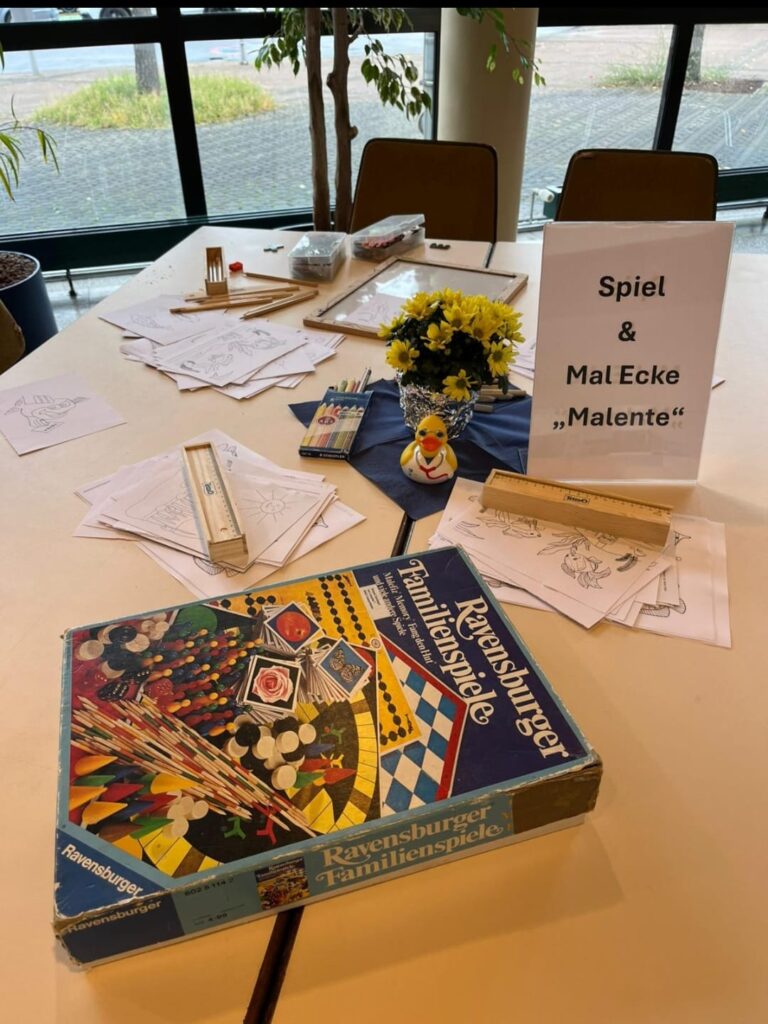 Sitzecke mit aquaristischem Antiquariat, sowie Spiel- und Malecke